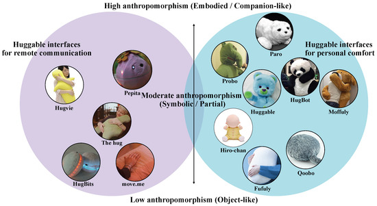 This section reviews prior research on huggable and tangible interfaces designed to convey emotional support or mediated social touch. We specifically focus on artifacts that are physically held, hugged, or placed in the environment, encompassing both huggable communication devices and huggable robots intended for emotional or therapeutic interaction. Wearable systems such as vests, wristbands, or garments are excluded from this review, as they represent a distinct class of technologies emphasizing on-body sensing or actuation rather than shared, co-present physical forms. By focusing on non-wearable haptic artifacts that embody or facilitate interpersonal affective exchange, we highlight how material form, anthropomorphism, and spatial presence influence users’ emotional experiences and perceptions of mediated intimacy. In this context, anthropomorphism refers to the extent to which a device’s form or behavior evokes human or animal qualities—such as the presence of limbs, facial features, or lifelike motion—that encourage users to attribute emotional or social characteristics to it. Varying degrees of anthropomorphism, from abstract object-like designs to expressive companion-like forms, play a crucial role in shaping how users interpret and emotionally engage with huggable technologies. Figure 1 situates the huggable systems reviewed in the literature within two main categories—those designed for remote communication and those aimed at personal comfort—distributed along an axis describing their degree of anthropomorphism.