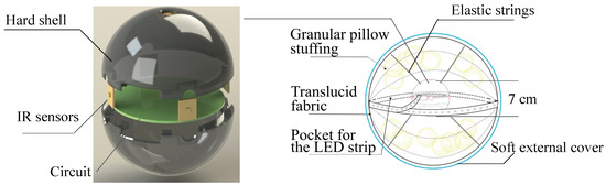 HugBits is a huggable communication device designed to foster emotional closeness between individuals separated by distance [14]. From its inception, the design emphasized the need for users to engage in genuine full-body hugs—embracing the device with both arms—a choice that informed key design choices such as its size and shape. The development of HugBits was shaped by insights gained from its predecessor, Pepita [15]. Pepita was originally conceived as an emotionally responsive robotic companion that was intended to promote emotional bonding through physical interaction. It featured a rounded, cartoon-like appearance and incorporated a conductive foam sensor to detect hugging gestures. However, the design was eventually criticized as being overly childish, prompting a shift toward a more neutral and socially acceptable aesthetic. For HugBits, we adopted a round, cushion-shaped form reminiscent of a familiar home pillow, an aesthetic choice aimed at maximizing comfort, warmth, and social acceptability (Figure 2). To preserve the tactile softness essential to its emotional function, particular care was taken to integrate the sensing components without compromising huggability. Instead of standard pressure sensors, which can be overly sensitive to localized hand pressures, we implemented infrared (IR) sensors capable of detecting the overall deformation of the cushion. HugBits employs a dual-cover design: an inner translucent layer that houses the hard shell, LEDs, and internal stuffing, and an outer removable cover that is soft to the touch and washable, supporting both comfort and long-term usability in daily life. All electronic components are compactly embedded within a 7 cm central shell and secured with elastic strings (Figure 3), minimizing rigid elements and preserving the organic softness of the device. This configuration supports a hug detection algorithm that considers not only pressure intensity but also the spatial distribution of touch, enabling the system to distinguish between a full-body hug and more incidental interactions. The hug detection algorithm and its performance evaluation have been described in detail in our previous work [14,26]. Feedback is conveyed through gentle vibrations and ambient lighting, providing a subtle, nonverbal expression of emotional reciprocity—allowing users to feel connected without intrusive cues.