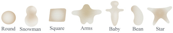 To represent the design spectrum as shown in Figure 1, we selected three shapes based on the prior literature labeled Square, Baby, and Arms (Figure 5). These reflect varying levels of anthropomorphism and functional emphasis. Complementing these, we included three additional shapes derived from patterns observed in the clay prototypes created during our participatory workshop. These user-informed designs—Snowman, Bean, and Star—reflect different combinations of symmetry, curvature, and expressiveness, grounded in the intuitive understanding of the participants of what makes a huggable communication device meaningful and acceptable. Together, the seven shapes illustrate a continuum from simple artifact-like cushions to more anthropomorphic body forms with limb-like extensions, as shown in Figure 5.