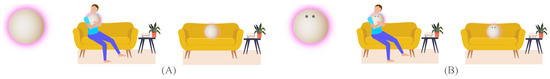Once participants understood the context and intended use of HugBits, the survey moved to the shape preference section. The participants were shown an illustration of the seven HugBits shapes. To avoid bias or emotional associations, in the survey we labeled the HugBits designs generically (Hugbits A, B, etc.). For clarity in this paper, we now use descriptive labels, as shown in Figure 5. They were asked to imagine the softness of a conventional cushion while envisioning themselves sending or receiving a hug, signaled by glowing HugBits. They were also instructed to mentally place the device in their daily environments, visible and accessible at all times. To support this scenario, we included a simple illustration showing a user interacting with HugBits in a domestic setting (Figure 6).