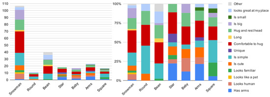 We examined potential associations between participants’ most and least preferred HugBits shapes. Although some patterns were observed, such as Snowman-preferring individuals often disliking Baby (13 respondents), Square-preferring individuals disliking Baby (6), and Bean-preferring individuals disliking Star (5), these trends were not statistically significant. Regarding the features associated with participants’ favorite HugBits, 62% of respondents selected “It looks comfortable to hug” as the most important characteristic. Other commonly mentioned features included “It is simple” (39%) and “I can hug and rest my head on it at the same time” (34%). The complete distribution of the selected features is shown in Figure 7. The left panel displays the absolute number of respondents who selected each feature, grouped by their preferred HugBits shape. This allows for a direct comparison of how many individuals associated specific features with different types of HugBits. In contrast, the right panel shows the relative distribution of features within each shape group, indicating the proportion of respondents who selected a given feature among those who chose that shape as their favorite. This normalized view enables easier comparison between shapes, regardless of the number of respondents in each group.