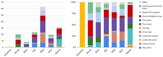 Regarding the least favorite HugBits, the features most frequently indicated were “It is too weird” (42%) and “It looks uncomfortable to hug” (34%). Figure 8 presents the full distribution of the selected features. As in the previous figure, the left panel shows the absolute number of respondents who associated each feature with their least preferred HugBits shape. The right panel displays the relative percentages, indicating the proportion of respondents within each shape group who selected a given feature. The responses classified as “Other” reflect the optional open responses from the participants, some of which are discussed in Section 6.