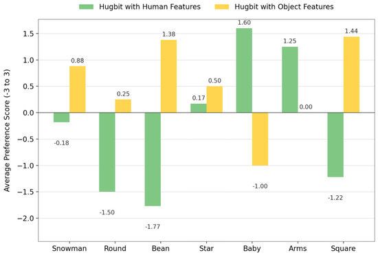 Average preference ratings for human-like versus object-like features across HugBits shapes. Positive values indicate greater preference for object-like designs, while negative values indicate preference for human-like features. Participants consistently favored object-like appearances for the Snowman, Bean, and Square shapes.