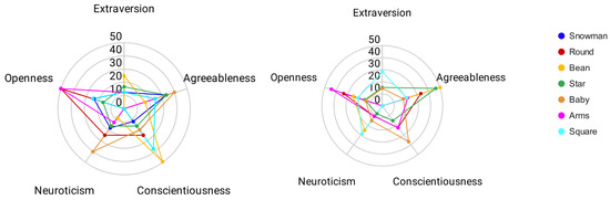 Personality traits can influence how users perceive and interact with technological artifacts, shaping their preferences, emotional engagement, and acceptance of design features. In human–computer and human–robot interaction research, the Big Five personality model—comprising Extraversion, Agreeableness, Conscientiousness, Openness, and Neuroticism—has been widely applied to explain individual differences in user experience and design evaluation [9,10]. Previous studies suggest that personality may affect users’ attitudes toward robots and their preferences for specific forms or levels of anthropomorphism [11,27]. For instance, users high in extraversion or agreeableness tend to prefer more socially expressive or anthropomorphic designs, whereas those lower in these traits often favor simpler or more neutral forms. Considering these findings, the present study included personality as an exploratory factor to better understand how individual dispositions relate to users’ shape preferences for huggable communication devices.