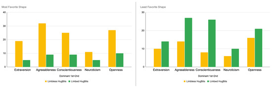 Dominant Big Five personality traits among participants for each most-preferred Hugbit shape (on the left) and the least favorite (on the right).