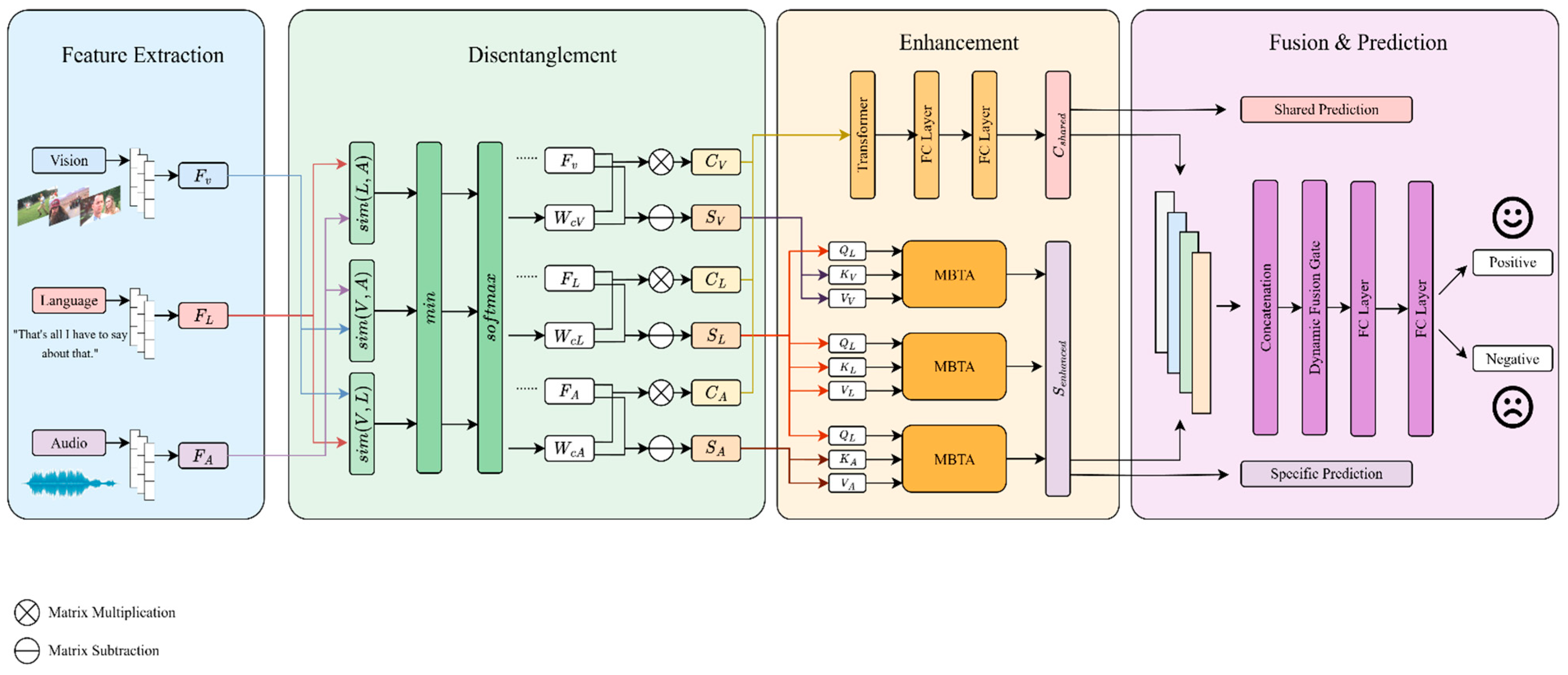 - A novel, end-to-end framework for MSA, termed DMBT, is proposed. It systematically addresses the limitations of existing methods through two core innovative modules for feature disentanglement and fusion.