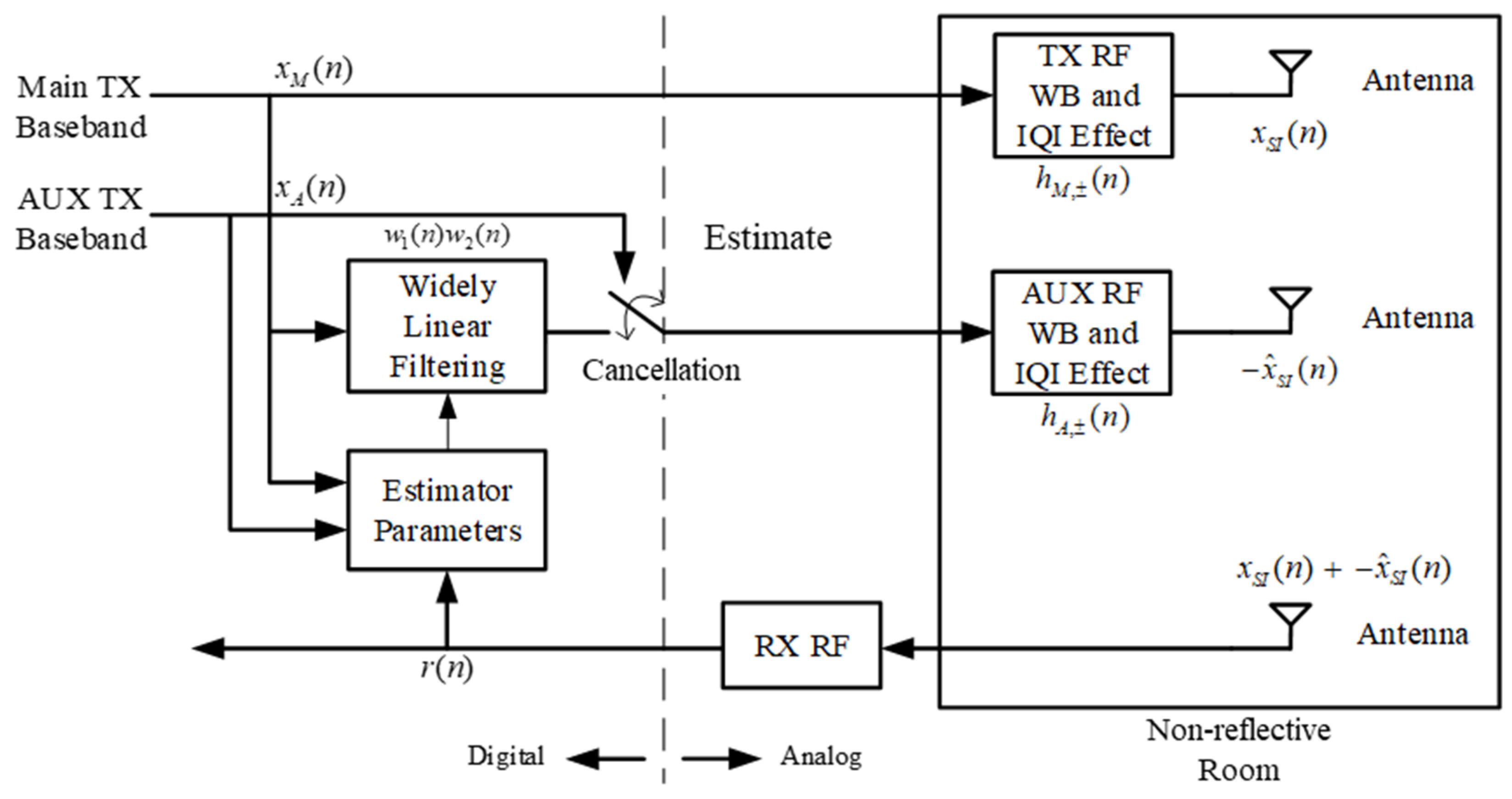 - Korpi, D.; Anttila, L.; Syrjälä, V.; Valkama, M. Widely Linear Digital Self-Interference Cancellation in Direct-Conversion Full-Duplex Transceiver. IEEE J. Sel. Areas Commun. 2014, 32, 1674–1687. [Google Scholar] [CrossRef]