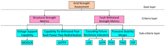 While this architecture offers considerable economic and environmental benefits, it also introduces a series of new and profound challenges to system stability [9]. The progressive replacement of conventional synchronous generators with resources interfaced via power electronic converters leads to a systemic decline in system rotational inertia and fault levels [10]. Not only is the inherent physical robustness of the grid eroded, but its natural ability to withstand and suppress disturbances is also weakened, resulting in more severe frequency and voltage deviations [11,12]. Consequently, accurately assessing the overall strength of such hybrid AC/DC grids is a critical yet challenging task. A realistic analysis must consider a composite of factors, including network structural integrity, stability margins, the AC system’s fault support capability for the DC system, and resilience against cascading failures [13,14]. However, the exploration of a unified indicator system that can holistically evaluate these interdependent aspects remains limited, highlighting a clear need for a more comprehensive approach. To address this, this paper proposes a grid strength assessment framework, constructed from the dual perspectives of structural strength metrics and fault withstand strength metrics. To fuse these heterogeneous metrics into a single, actionable composite index, a hybrid AHP-CRITIC weighting method is adopted to synergistically balance expert judgment with objective data-driven evidence [15].