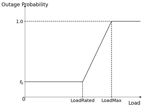 In this probability chain, the probability of each state transition is closely related to the failure behavior of specific physical components. Therefore, to obtain accurate transition probabilities, it is necessary to establish appropriate fault models for critical components. Based on the data from [28], the dynamic relationship between a line’s outage probability and its loading level is modeled using the piecewise function illustrated in Figure 2.