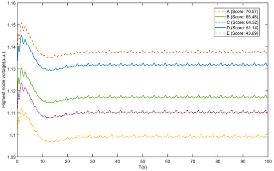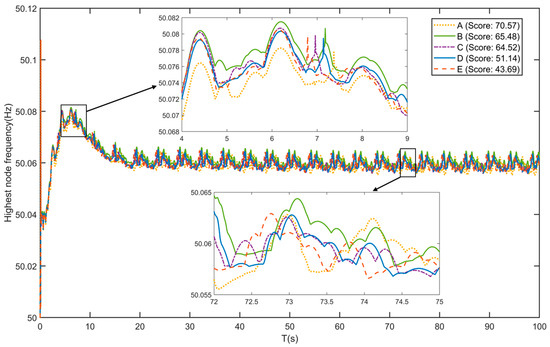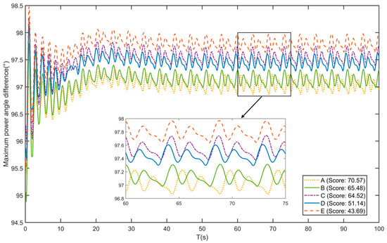 Using the derived composite weights, this study assessed various operating scenarios based on the “summer peak load” condition for the year 2027. Figure 3, Figure 4 and Figure 5 illustrate the maximum power angle separation, maximum frequency, and maximum nodal voltage during the transient stability process for five different scenarios following the same fault. The composite index scores for these five scenarios, denoted as A, B, C, D, and E, are 70.57, 65.48, 64.52, 51.14, and 43.69, respectively.