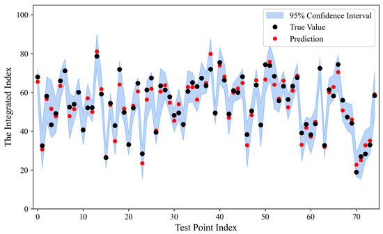 A training dataset of 100 samples was randomly generated. For each sample, the indices mentioned in Section 2 were calculated and then fused into a composite index. The GPR model was subsequently trained on this dataset. To verify the accuracy of the GPR simulator, its predictive performance was evaluated on an independent, unseen test set. As shown in Figure 6, the predicted values from the GPR model are in close agreement with the true values from simulations, and nearly all true values fall within the 95% confidence interval of the predictions. To further ensure the robustness of the model evaluation, a repeated 5-fold cross-validation strategy was employed. The entire 5-fold cross-validation process was independently repeated 100 times with different random seeds, yielding a mean Absolute Percentage Error (MAPE) of 4.87%. This confirms that the GPR simulator can serve as a reliable and accurate proxy for the full system model.
