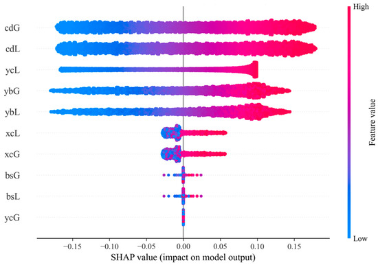First, a global analysis was performed to identify the system variables that have the most significant impact on stability across the entire operational space. Figure 7 illustrates the contribution of different input feature values to the output. Specifically, it shows how the value of an input feature influences whether the output is increased (SHAP value > 0) or decreased (SHAP value < 0). Each point represents the Shapley value for a feature in a specific instance; red indicates a high feature value, while blue indicates a low feature value. The features on the y-axis are ordered by increasing importance from bottom to top. This plot aggregates the local SHAP values from all samples, not only revealing the overall ranking of feature importance but also displaying the distribution, density, and direction of their impacts.