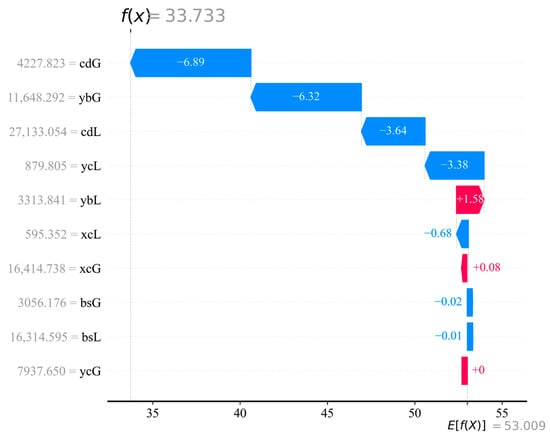 Beyond global ranking, SHAP is also capable of diagnosing individual operating scenarios. To demonstrate this capability, a scenario with a low predicted grid strength index was selected from the test set. Figure 8 presents the SHAP contribution plot for this single instance. The diagram decomposes the prediction, clearly showing how the value of each feature pushed the model’s output from the baseline value to the final prediction for this scenario.