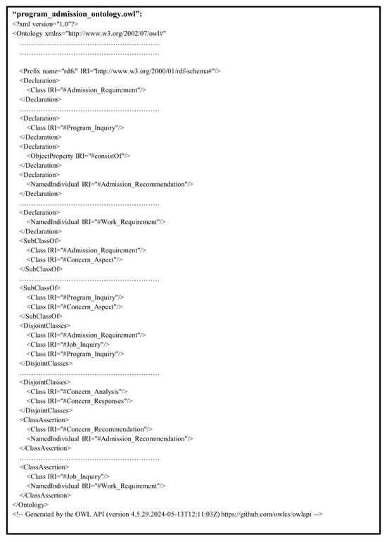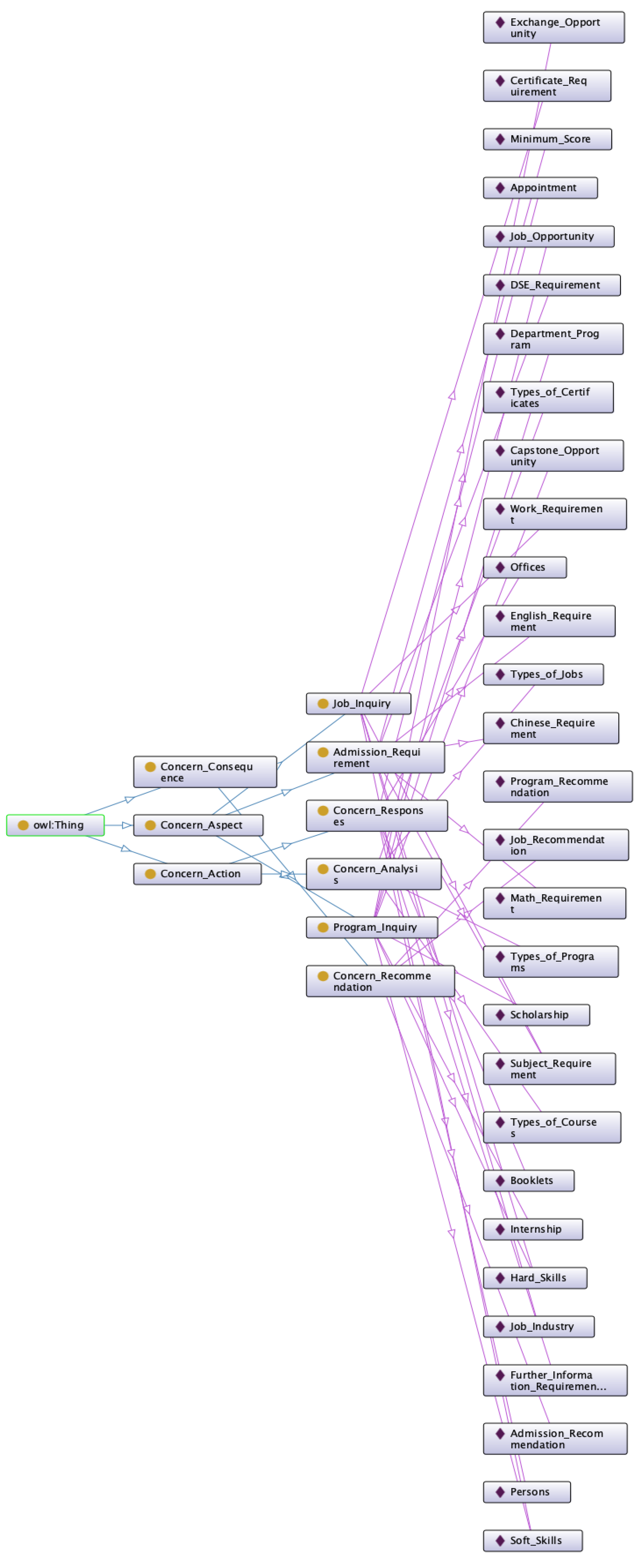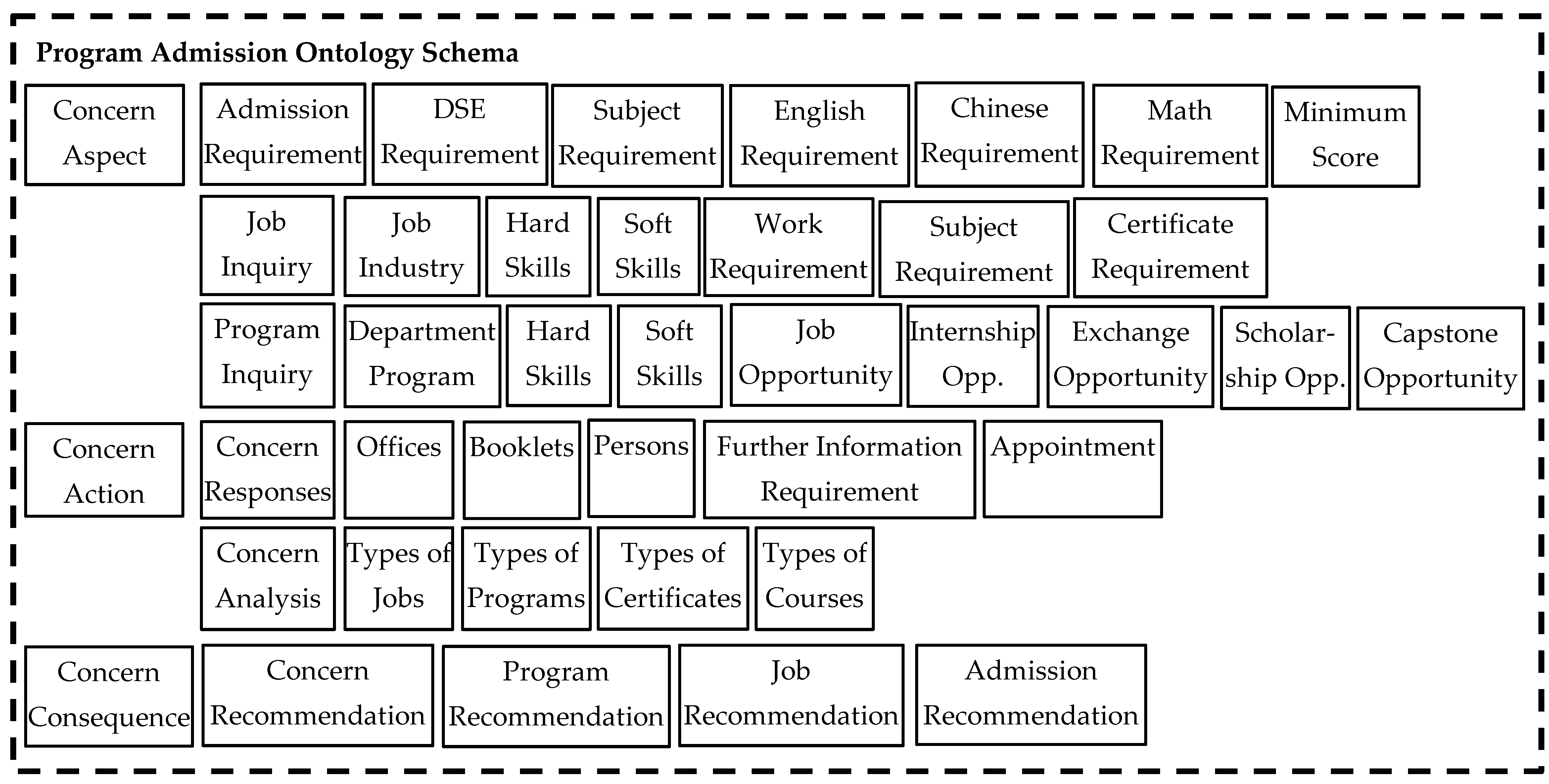 | Step 1: Construct the Components of the Concern Aspect in the Program Admission Ontology. | It contains the Admission Requirement Inquiry Entity, the Job Inquiry Entity, and the Program Inquiry Entity. |