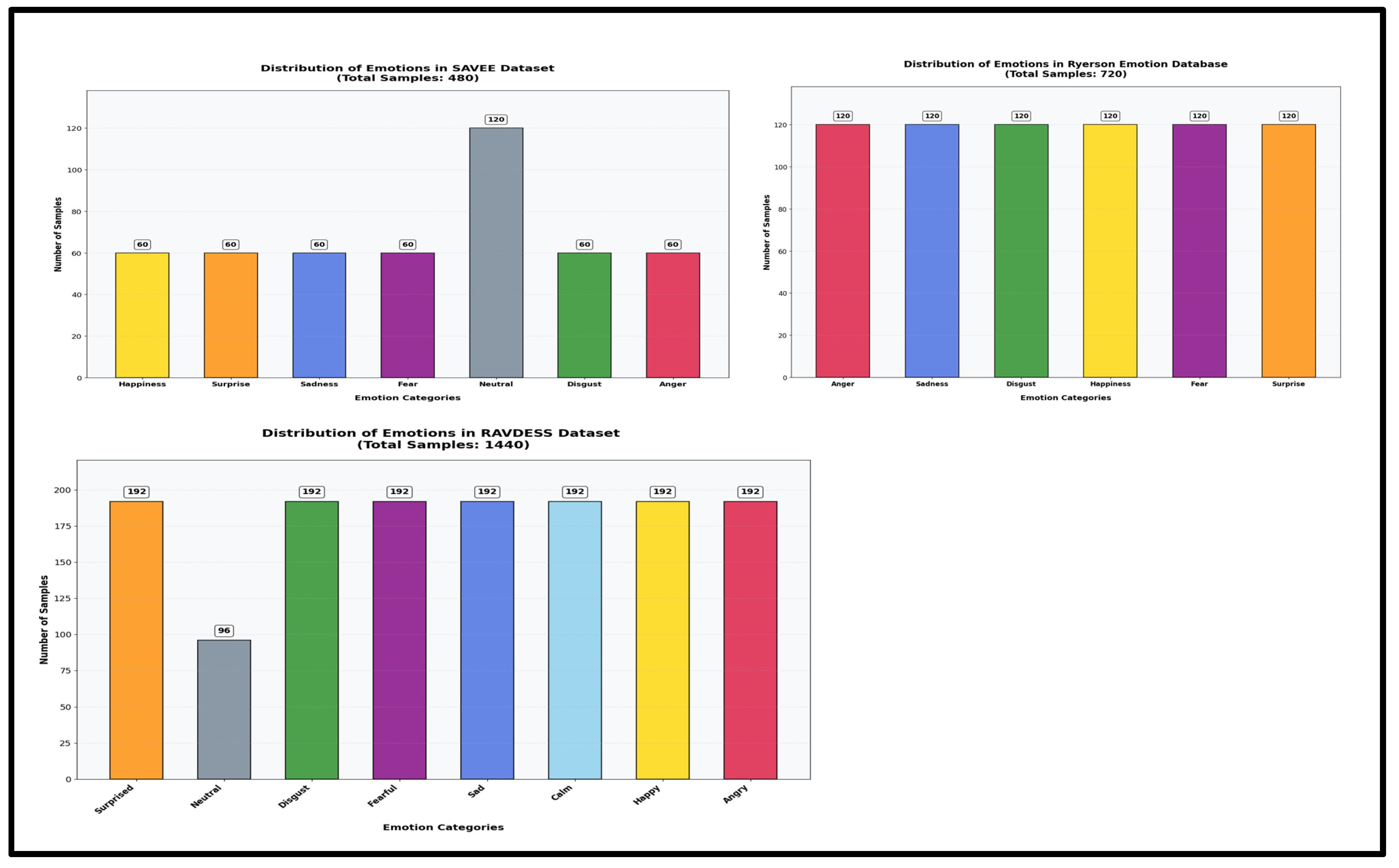 - The Surrey Audio-Visual Expressed Emotion (SAVEE) dataset [15] consists of recordings from four native male British actors at the University of Surrey in seven distinct emotions: neutrality, happiness, sadness, anger, fear, disgust, and surprise. Each actor contributes 120 English utterances, resulting in a total of 480 video samples.