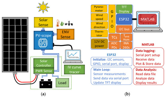 (a) Measurement system consisting of a PV module under test, the PV-Scope unit, irradiance sensors (Solar Sense), environmental sensors (ENV Sense), and a solar controller integrated with power sensors (PWR Sense) or an IV curve tracer. (b) The ESP32 interfaces with measurement devices through the I2C bus and GPIO pins and via serial port with MATLAB. The main software processes are summarized for the ESP32 and MATLAB.