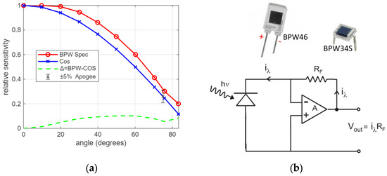 (a) Vishay BPW photodiode relative angular sensitivity from the datasheet compared to a cosine response and their difference (Δ) as well as the Apogee spec at 75. (b) Transimpedance amplifier circuit with no bias voltage. Photodiodes from the Vishay BPW series for side-coupling and top-coupling.