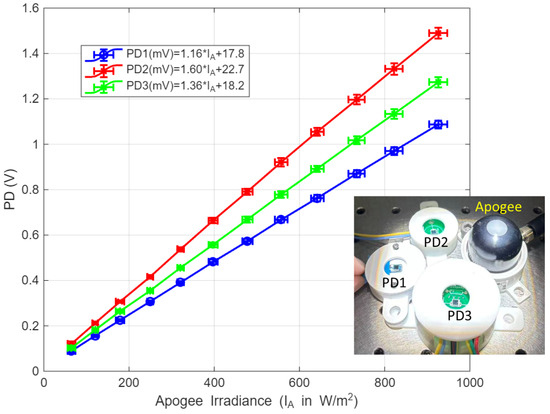 Photodiode calibration against Apogee pyranometer under a solar simulator. PD2 and PD3 were measured with diffusers. (inset) Photodiodes (without diffusers) and Apogee pyranometer placement in the solar simulator beam.