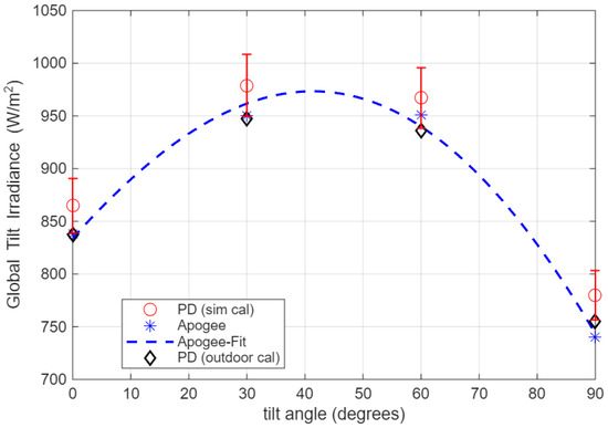 Outdoor measurements for photodiode (PD) and Apogee POA irradiance versus the PV module tilt angle from horizontal, and a quadratic curve fit for each. Two calibration factors are shown for the PD, using the solar simulator and outdoor fit to the Apogee results. Error bars of +/−3% are shown on the PD (sim cal) measurement, representing the simulator beam nonuniformity.