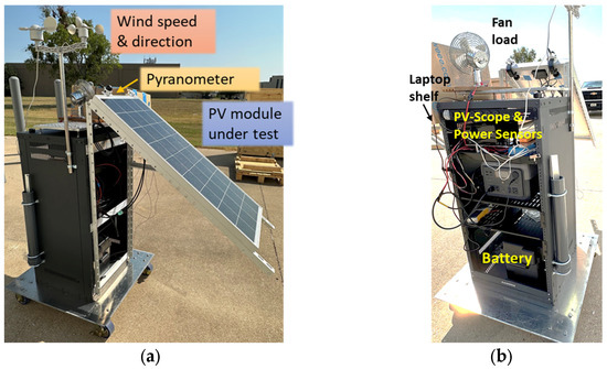 (a) PV-Scope test system with mounted PV module under test that can be set at different tilt angles. The anemometer is mounted on the side. (b) PV-Scope, thermocouples (T/Cs), and solar controller with power sensors are mounted on the top shelf with the battery on the bottom shelf.