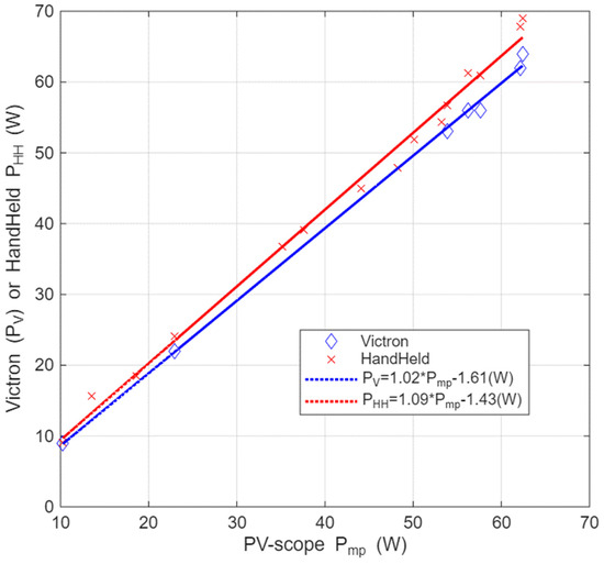 Comparison of maximum power point measurements with respect to our PV-Scope measurement (Pmp) for the handheld (HH) Frogbro EY1600W and Victron (V) solar controller. The fit parameters are shown in the legend.