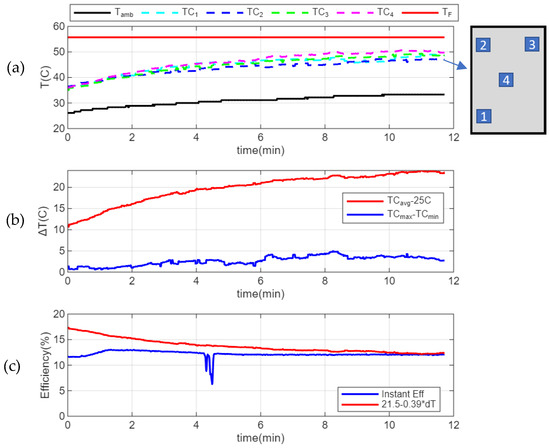 The uncertainty in the temperature measurements will impact the temperature-dependent efficiency modeling. For T-type thermocouples, the uncertainty is ±0.5 °C. The amplifier (MCP9600) contributes an additional ±0.5 °C of uncertainty, including the cold junction compensating uncertainty. The uncertainty in the thermal contact resistance is estimated to be ±1 °C due to the adhesive mounting. Thus, the overall uncertainty in the temperature measurement is the RMS value of these contributions, or .