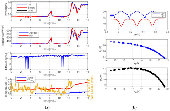 (a) Time series with cloud cover to sunny conditions showing maximum power, irradiance, efficiency, temperature, and wind speed data. (b) Time series around first solar controller testing interval and resulting I-V and P-V plots.