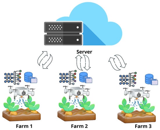 - Federated Averaging (FedAvg): The model aggregation method used in this framework is FedAvg. In each communication round, after the clients complete their local training, the server aggregates the model updates using FedAvg. The aggregation process computes a weighted average of the local models based on the amount of data processed by each client, resulting in an updated global model that is broadcast to all clients for the next round of training [28].