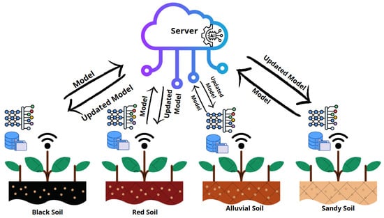 SA powered by FL in heterogeneous soil types: IoT sensors deployed across soil categories collect localized data. These sensors collaboratively train a global model while preserving data privacy.