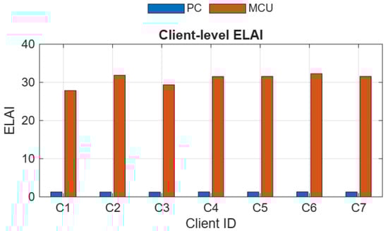 Figure 5 shows the client-level ELAI across all 7 clients. Although PC-based training achieves slightly higher accuracy in some cases, the much higher energy consumption (∼65 mJ per inference) results in consistently lower ELAI values compared to MCU devices (∼0.95 mJ per inference). This indicates that MCU devices provide substantially better efficiency across all clients, despite modest accuracy differences.