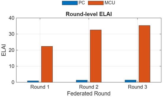 Figure 6 presents the round-level server ELAI over 3 communication rounds. Both MCU and PC accuracies improve as training progresses, but MCU maintains a clear advantage in ELAI throughout all rounds. This shows that MCU devices remain preferable when efficiency is considered a primary deployment constraint in IoT scenarios such as smart irrigation.