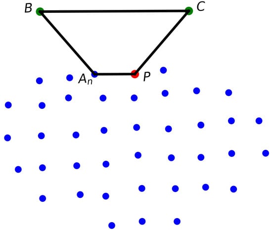 Schematic illustration of point P, its neighboring points, and the boundary detection region. In the figure, the red point represents P, the blue points represent P’s neighboring points, and the green points B and C represent points obtained through the construction of the boundary detection region .