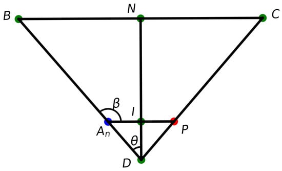 To more clearly illustrate the method for constructing the boundary boundary detection detection boundary detection region , the region is drawn separately. The intersection D of the extended lines  and , the midpoint I of , and the midpoint N of  are marked, and a line connecting points N and D is drawn, as shown in Figure 4.