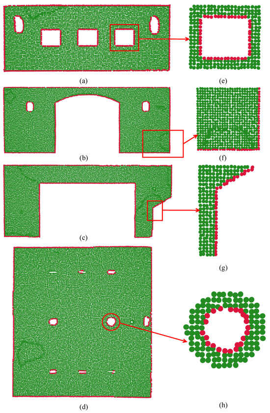 In this section, we present the experimental results of the algorithm introduced for extracting boundary points of planar building components from point clouds, along with an analysis. Meanwhile, the proposed algorithm is evaluated against the Angle Criterion (AC) method and the Alpha Shapes (AS) method. The Angle Criterion (AC) method [,,] and the Alpha Shapes (AS) method [,,,,,,,] are classical boundary point extraction algorithms that have been widely applied to boundary point extraction in the field of point clouds [].