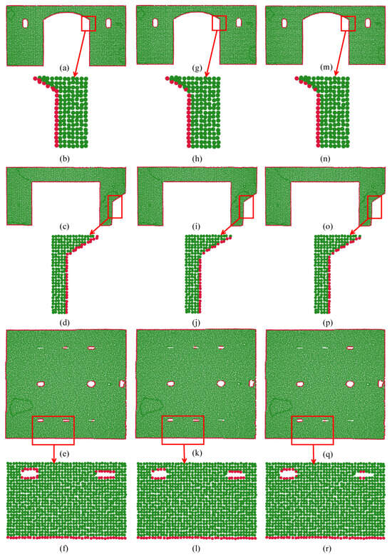 Boundary point extraction results for Models 2–4 using three methods. Panels (a,c,e) present the results of the proposed algorithm; (g,i,k) present the results obtained by the Angle Criterion method; and (m,o,q) present the results obtained by the Alpha Shapes method. The local magnified views are as follows: (b,d,f) correspond to (a,c,e); (h,j,l) correspond to (g,i,k); and (n,p,r) correspond to (m,o,q).