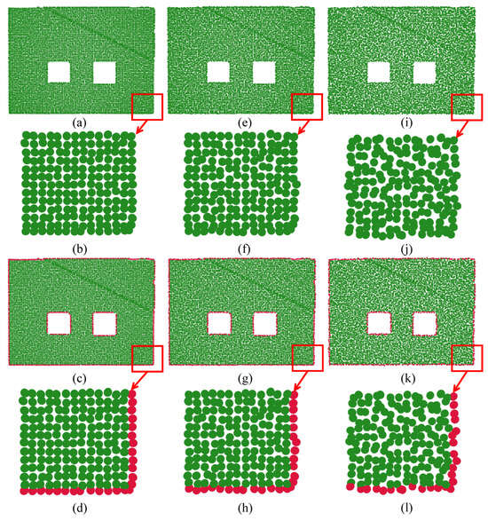 Boundary Point Extraction Results of the Proposed Algorithm on Noise-Free and Noisy Point Clouds of Model 5. (a) Noise-free Model 5; (e,i) Model 5 with zero-mean Gaussian noise, with standard deviations of 10% and 20% of the average point spacing, respectively; (c,g,k) present the boundary points extracted from (a,e,i), respectively; (b,f,j) present the local magnified views of (a,e,i), respectively. (d,h,l) present the local magnified views of (c,g,k), respectively.