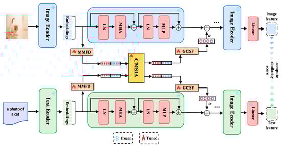 Two mainstream transfer schemes have recently emerged in this field. The first is prompt learning, which introduces learnable prompt vectors, such as CoOp [] and MaPLe []. By freezing the pre-trained parameters and optimizing only a small number of prompts, this approach achieves a balance between training efficiency and few-shot adaptability. The second is the use of lightweight modules, such as CLIP-Adapter [], which improves cross-modal alignment through residual lightweight components, and Tip-Adapter [], which enables efficient adaptation via a non-trainable key–value cache mechanism. Both approaches aim to enhance task adaptability at low computational cost. However, they still face notable limitations. On the one hand, most methods emphasize single-modality modeling while overlooking the intrinsic semantic dependencies between image and text in decision-making. On the other hand, in few-shot scenarios, they are susceptible to interference and even catastrophic forgetting of pre-trained general knowledge, which undermines the effectiveness of representations. As a result, models struggle to fully exploit pre-trained semantic information, thereby constraining their adaptability and robustness.