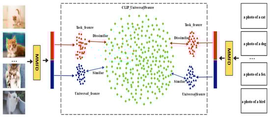 Inspired by the work of Wang [], who demonstrated that constraining model updates along the directions corresponding to the smallest singular values during incremental learning can effectively preserve the generalization knowledge in pre-trained models, we propose a non-centralized covariance-based dual-subspace decomposition method. We extend this principle to the multimodal scenario, achieving a statistical separation of multimodal features by jointly decoupling textual and visual representations. It should be noted that the “universal subspace” and the “task-specific subspace” do not correspond to strict semantic partitions; rather, they represent a statistical approximation based on the covariance structure of the features. The universal subspace corresponds to the principal directions with higher variance, which typically capture stable and transferable features learned during large-scale pre-training, thereby helping to retain generalization ability and mitigate catastrophic forgetting when adapting to downstream tasks. In contrast, the task-specific subspace is spanned by low-variance or residual directions, which exhibit higher plasticity, allowing the model to flexibly adapt to the distribution of downstream tasks without disrupting the pre-trained representations. A schematic illustration is shown in Figure 2.
