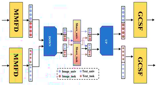 Here,  and  are the downsampling matrices for the visual and text modalities, respectively, while  and  are the upsampling matrices.  and  are the interaction matrices for different subspace features, and (.) represents the activation function, implemented as Relu. After cross-modal interaction  and  capture the universal and task-specific subspace features of the visual modality, while  and  encode the corresponding representations for the textual modality.
