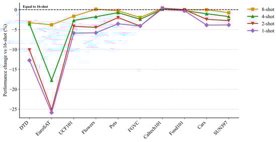 To evaluate the adaptability of our model in data-scarce scenarios, we conducted experiments under low-sample training conditions of 1, 2, 4, and 8 shots, examining performance fluctuations across different sample sizes. The results are presented in Figure 4. As the number of samples decreases from 16 to 1, overall performance declines, although the reduction remains relatively moderate. Notably, the model maintains high accuracy under 8-shot and 4-shot conditions, demonstrating strong robustness and generalization. Certain datasets, such as Pets and Caltech101, exhibit minimal sensitivity to sample size, with negligible performance fluctuations, indicating effective adaptation to low-sample conditions. In contrast, datasets including EuroSAT, FGVC, and DTD are more sensitive, showing substantial performance degradation as the number of shots decreases. Even at extremely low sample sizes (1 or 2 shots), the model retains reasonable performance overall, highlighting its stability and practical utility in few-shot learning tasks. These results demonstrate that the proposed model consistently achieves strong performance under constrained data conditions, supporting its applicability in real-world few-shot scenarios.