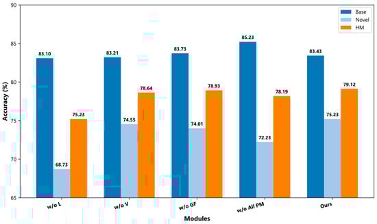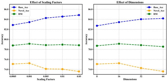 We conducted a sensitivity experiment on the shared layer dimension in the cross-modal semantic interaction module to analyze its impact on model performance. As shown in Figure 6 (left),the accuracy of the Base class gradually increases with the increase in the dimension, from 82.27 at a smaller dimension to 84.18 at a larger dimension, indicating that a larger dimension helps improve the model’s ability to fit the seven categories, but the accuracy of the Novel class begins to decline after the dimension reaches 32, indicating that too large a dimension may introduce more trainable parameters, resulting in overfitting on new classes with less data. Considering the performance of both Base and Novel classes, the harmonic mean reaches the best when the dimension is 16. Therefore, choosing a moderate shared layer dimension helps to improve the model’s expressiveness while taking into account the generalization performance of new classes.