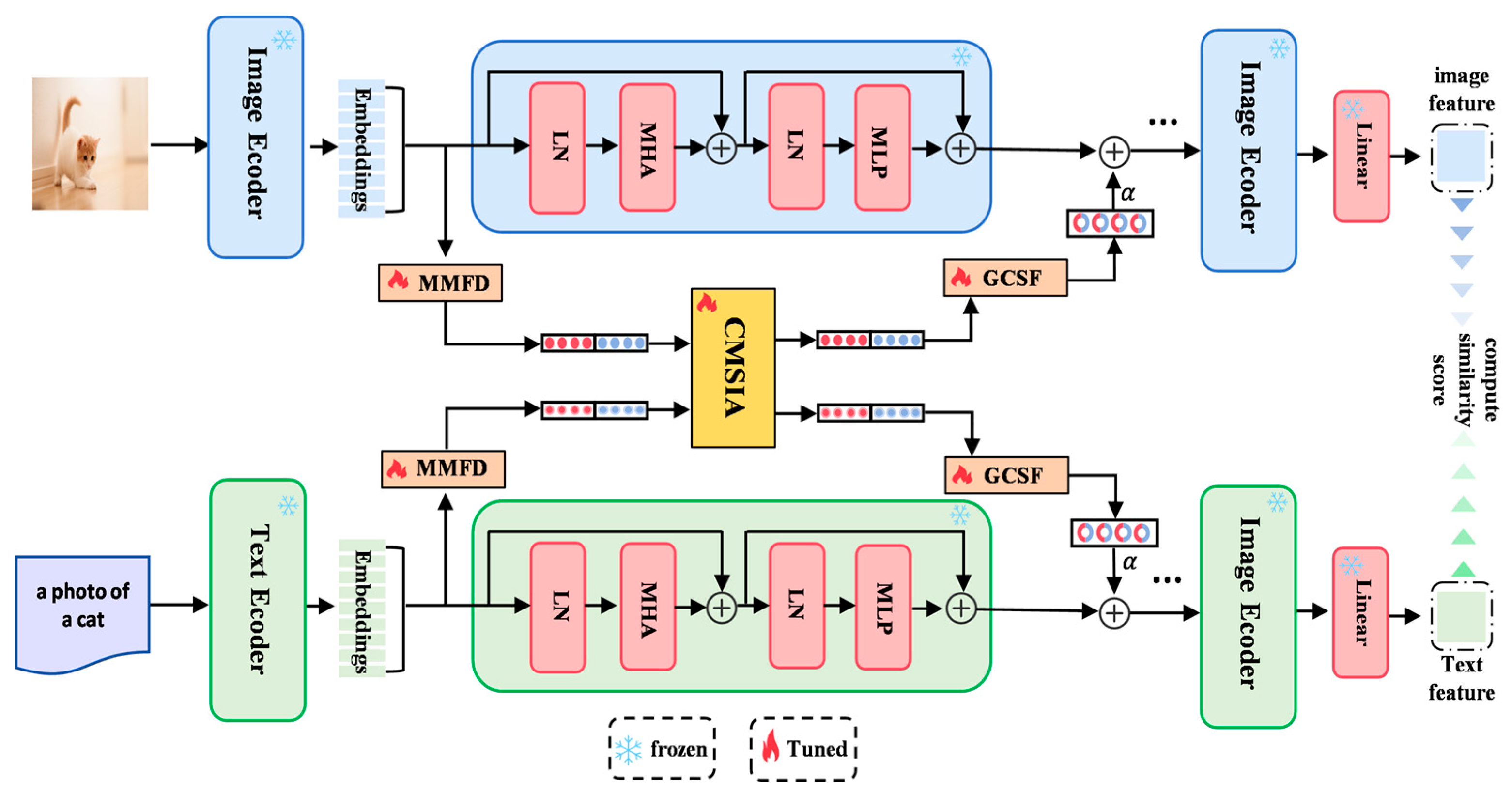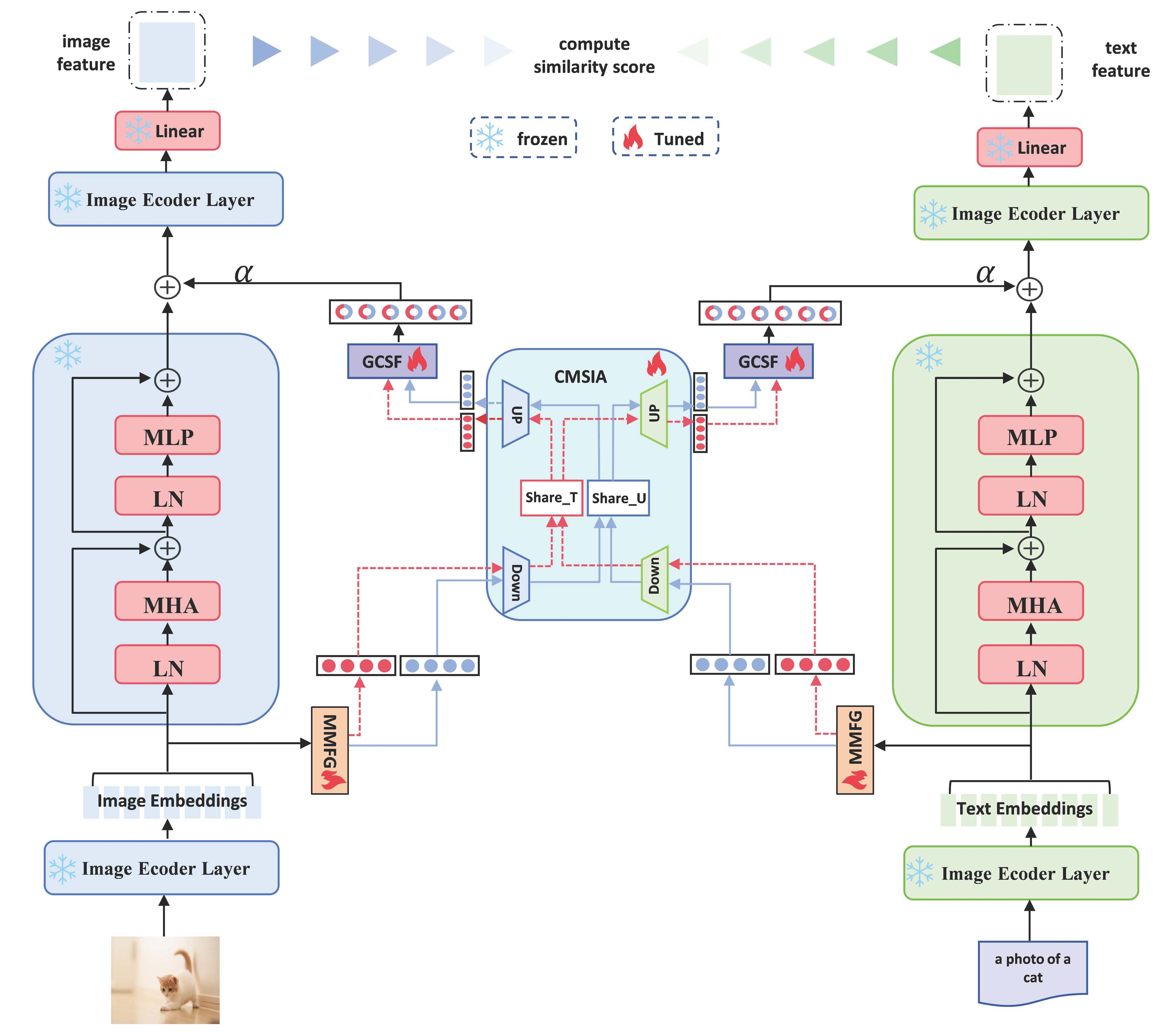 | for each image I_i and text T_k: Xv, Xt = VisualEncoder(I_i), TextEncoder(T_k) for layer = 1 to L: # 1. Multi-Modal Feature Disentanglement Xv_univ, Xv_task = MMFD(Xv) Xt_univ, Xt_task = MMFD(Xt) # 2. Cross-Modal Semantic Interaction Adapter Xv_univ_mut, Xt_univ_mut = CMSIA(Xv_univ, Xt_univ) Xv_task_mut, Xt_task_mut = CMSIA(Xv_task, Xt_task) # 3. Gated Cross-Level Semantic Fusion beta_v = GatingNetwork(concat(Xv_task_mut, Xv_univ_mut)) beta_t = GatingNetwork(concat(Xt_task_mut, Xt_univ_mut)) Xv_fused = beta_v Xv_task_mut + (1-beta_v) Xv_univ_mut Xt_fused = beta_t Xt_task_mut + (1-beta_t) Xt_univ_mut # Residual connection Xv, Xt = Xv + alpha_res Xv_fused, Xt + alpha_res Xt_fused |