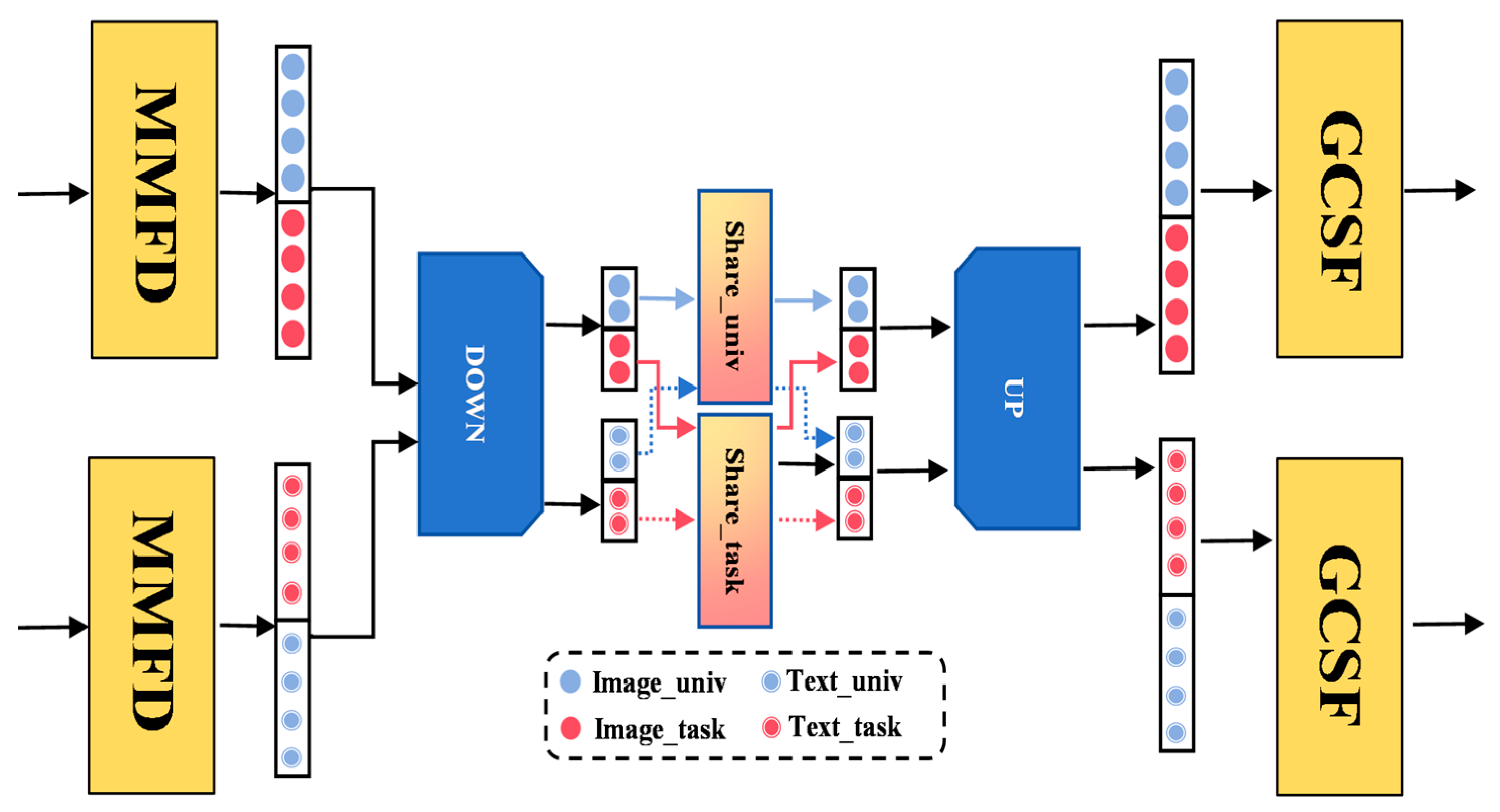 - Based on the dual-subspace architecture, a cross-modal semantic interaction adapter module and a gated cross-level semantic fusion module are introduced. The former performs independent interactions between shared and task-specific subspace features to avoid interference between general and task knowledge, while the latter employs a gating mechanism to dynamically adjust feature weights across levels, ensuring consistent semantic alignment.