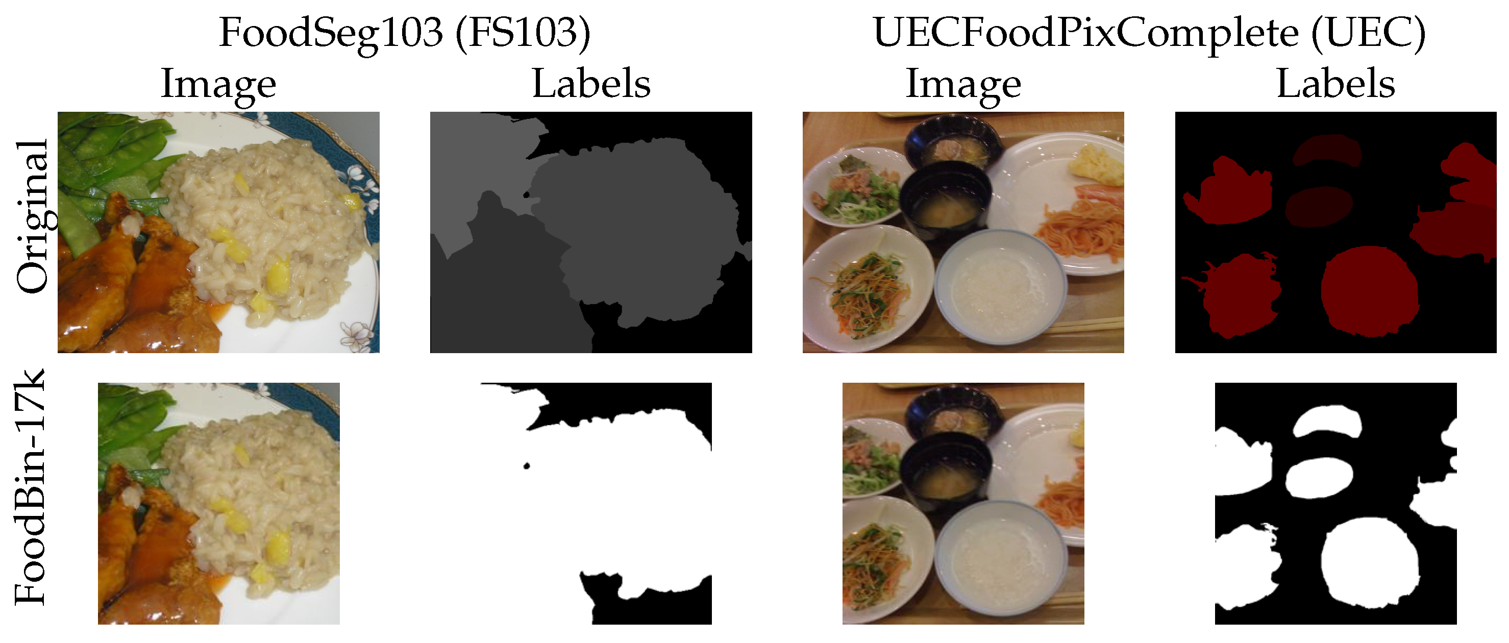 To establish a large dataset of binary pixel-wise labels of food images (food/not food), we combined two datasets of labeled food images, FoodSeg103 (FS103) and UECFoodPixComplete (UEC), to create a single dataset. The FS103 dataset [