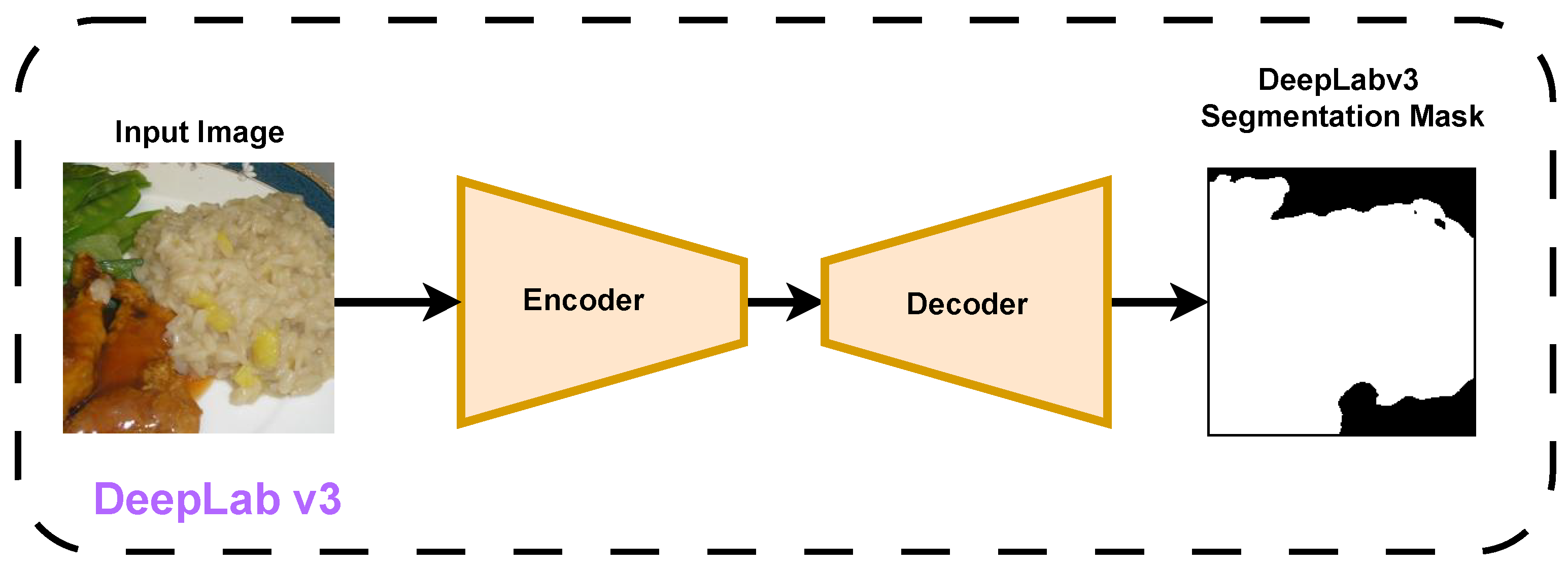 DeepLab v3 model for learning to segment food images. The predicted masks are used for the SAM prompt generation step.