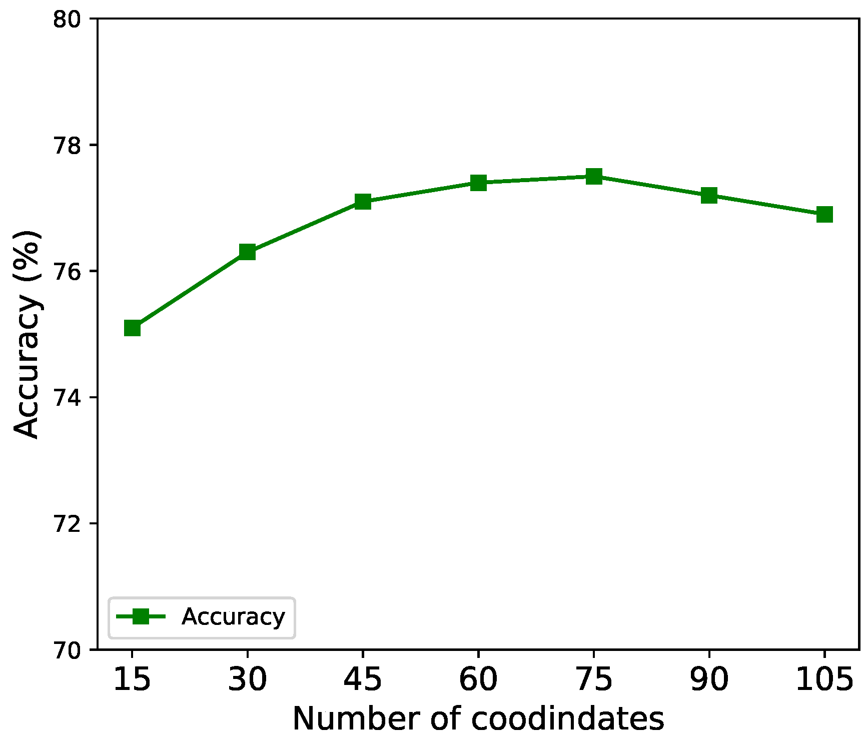 Line plot of accuracy performance for the SAM deep neural network for different sizes of point coordinates.