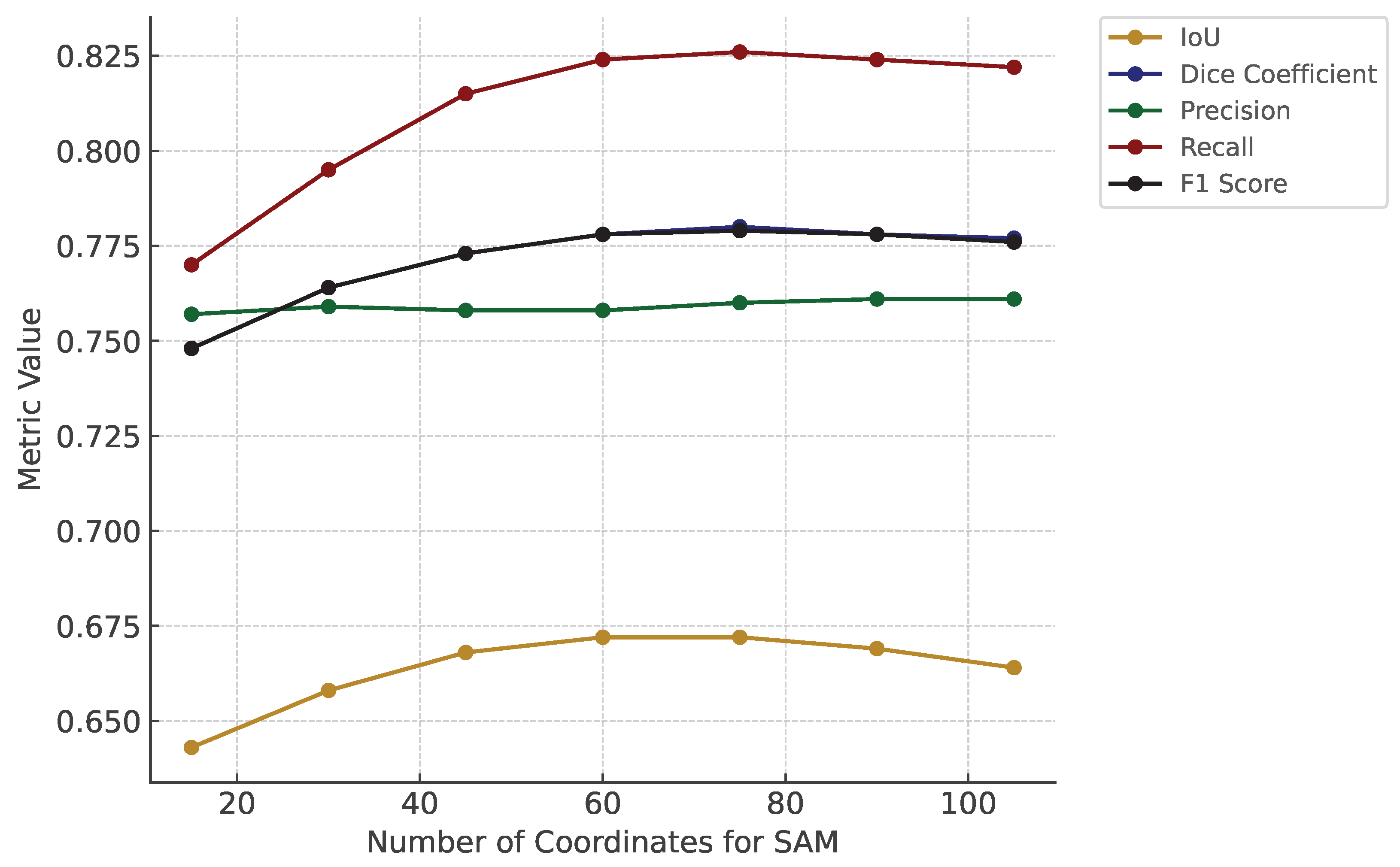 | # Coords for SAM | Accuracy (%) | IoU | Dice Coefficient | Precision | Recall | F1 Score |