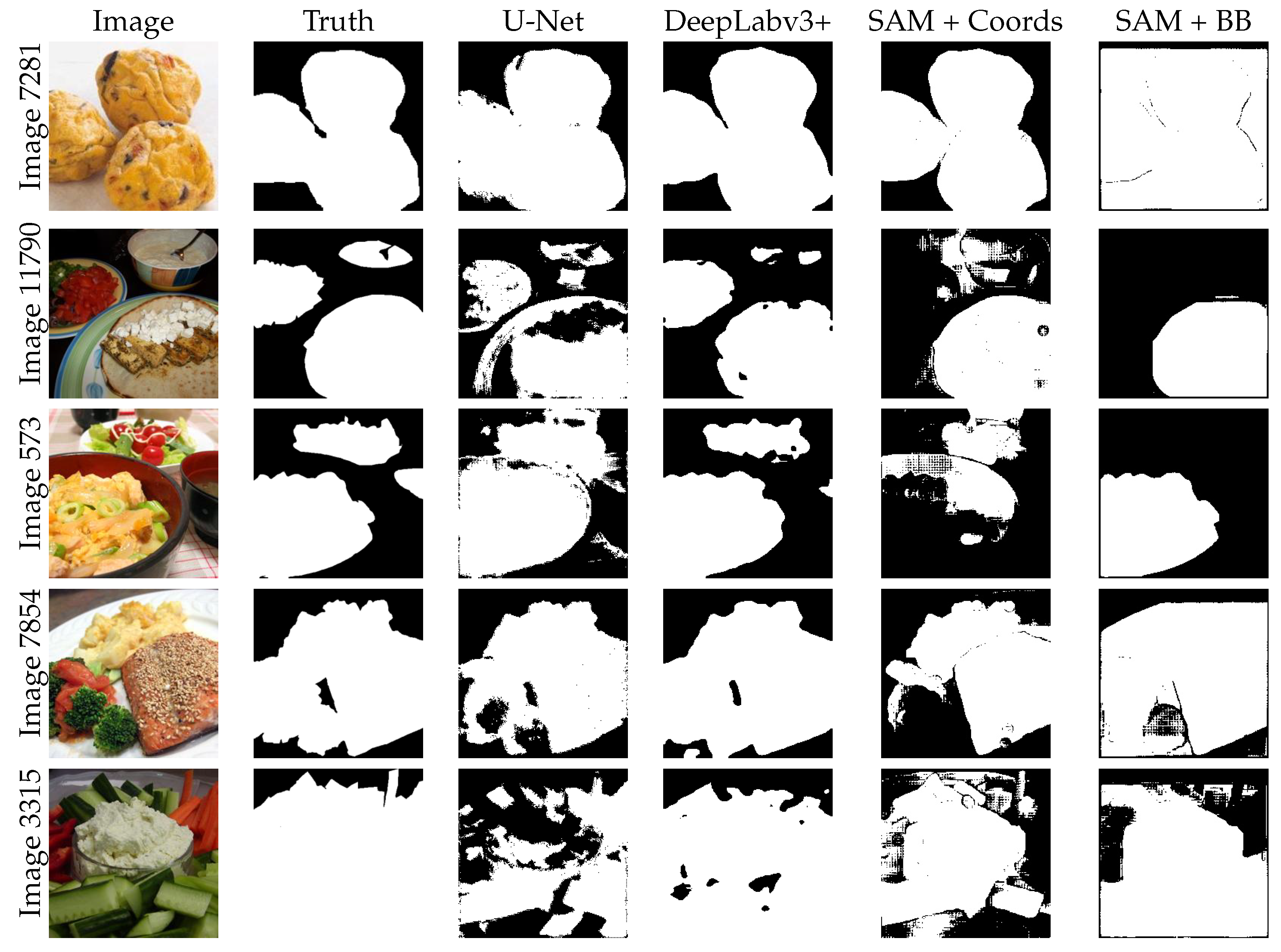An advantage of using zero-shot SAM as a foundation model is to obtain quick and effortless masks for food images without the need for obtaining a large annotated dataset and training supervised deep learning models. This approach is time-consuming; for instance, in this work training, U-Net took 640 min and 25 s, whereas DeepLabv3+ took 159 min and 32 s. Zero-shot SAM prompting took about 20 min for 75 coordinates prompting, and 24 min for bounding box-based prompting as indicated in