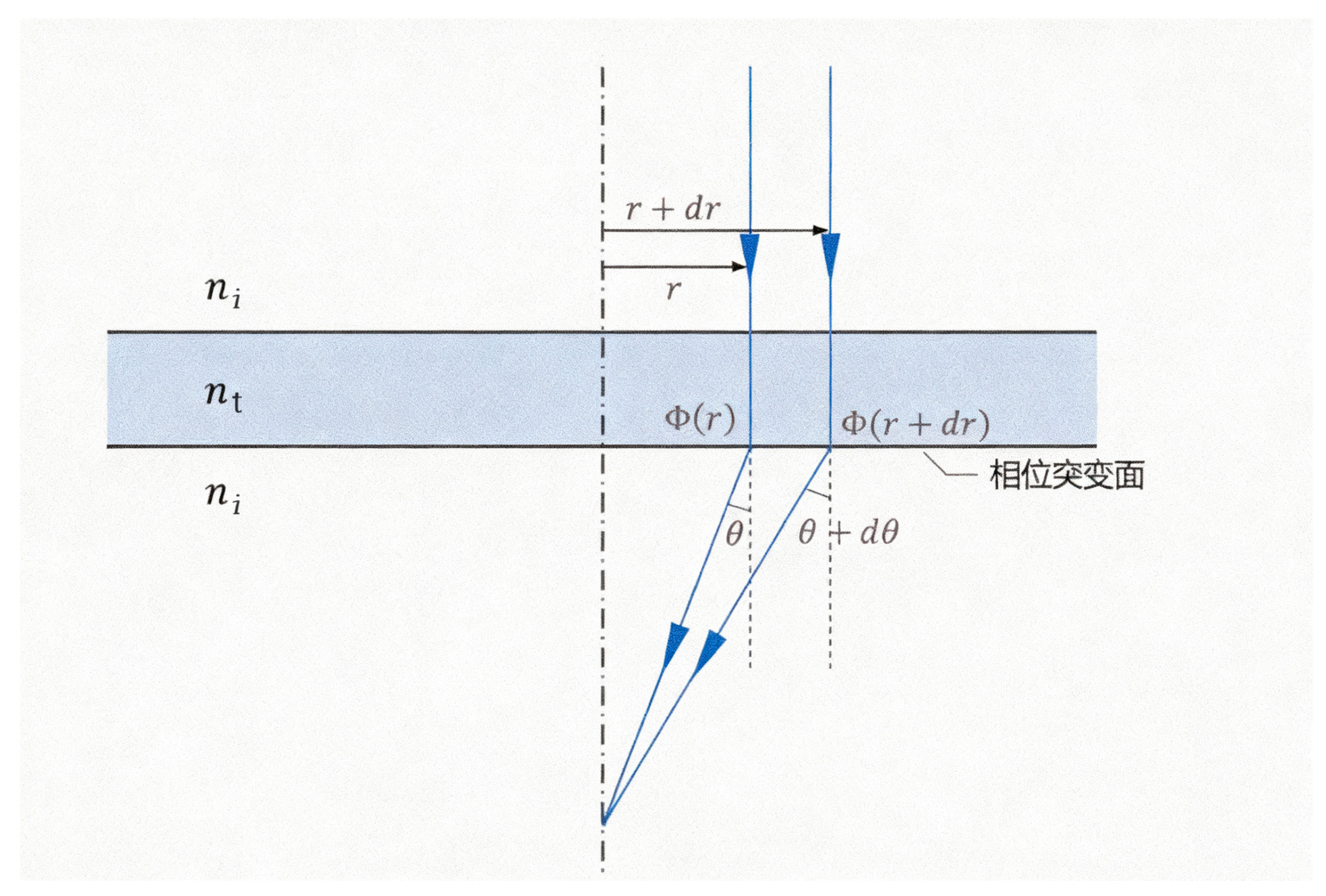 - The design of the phase gradient method is based on the “normal incidence” assumption—the preset phase gradient can only meet the requirement of “optical path difference matching” when the incident light is perpendicular to the metalens surface. When the incident light is obliquely incident (incident angle θ > 0), the optical path difference of the incident light on the metalens surface changes, resulting in a deviation between the actual phase gradient and the preset value.