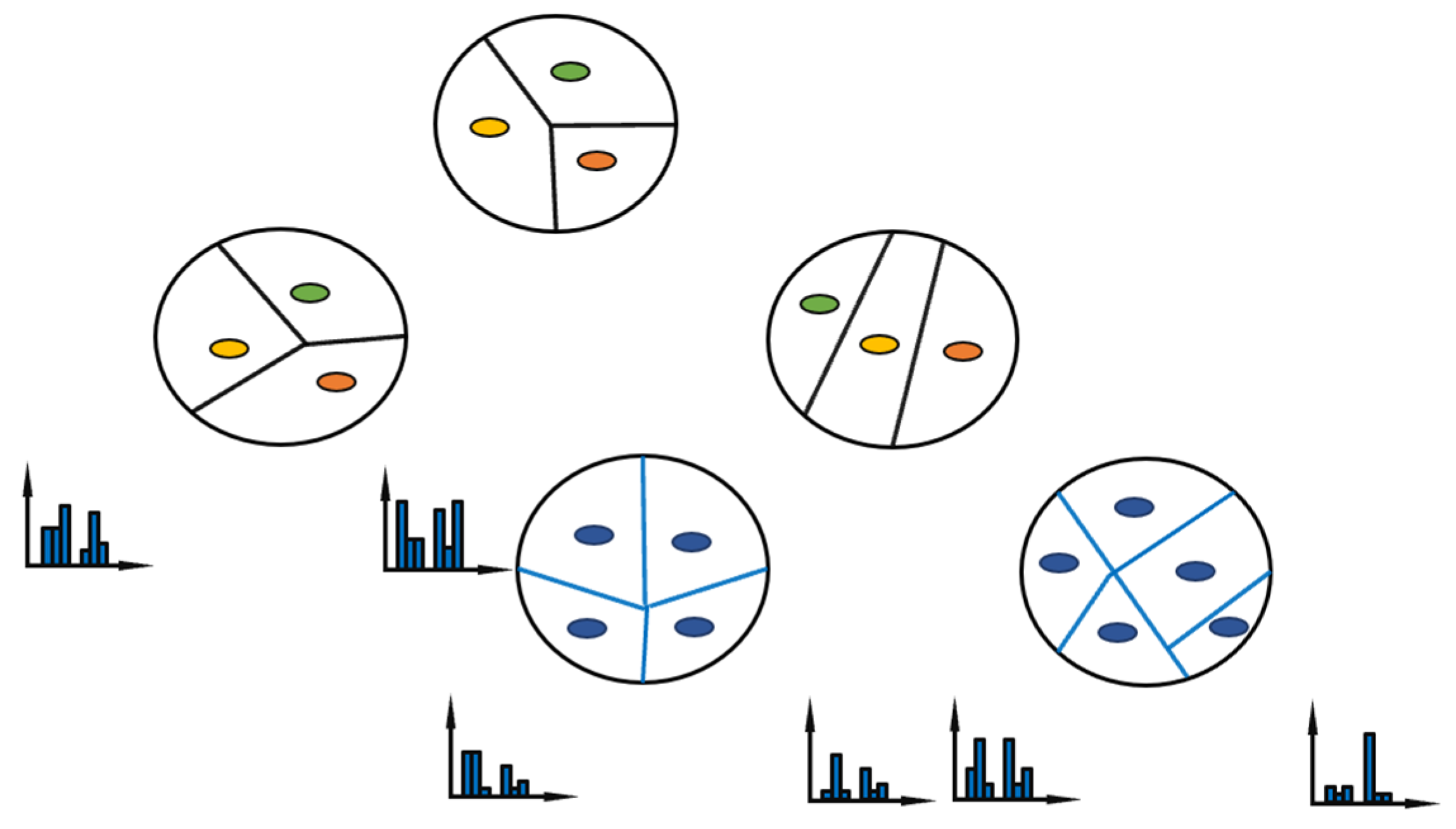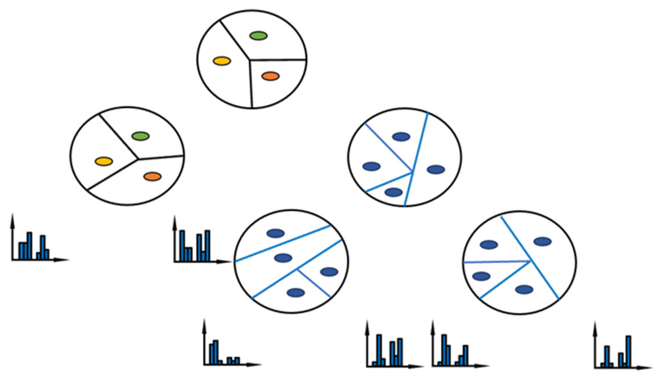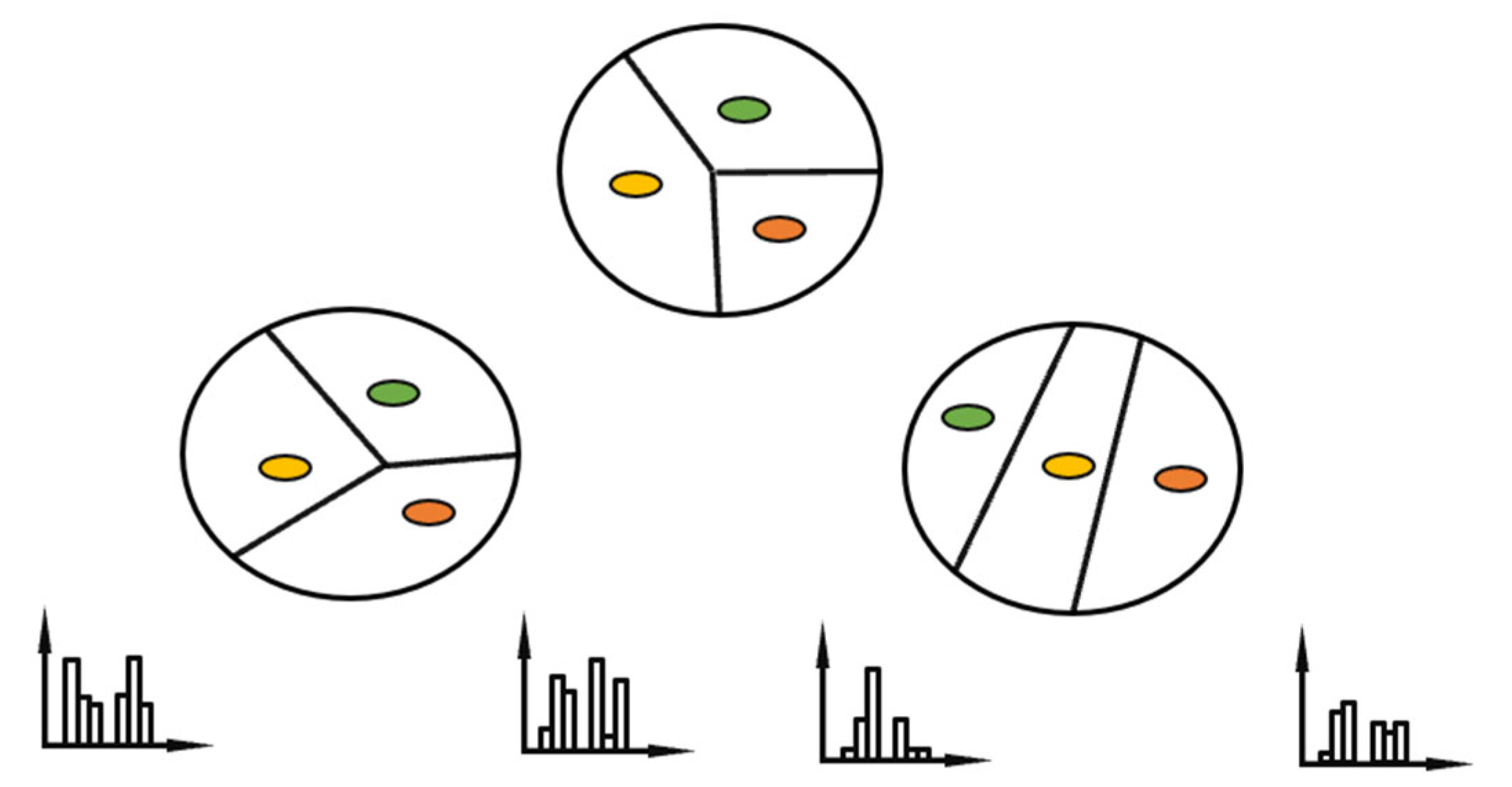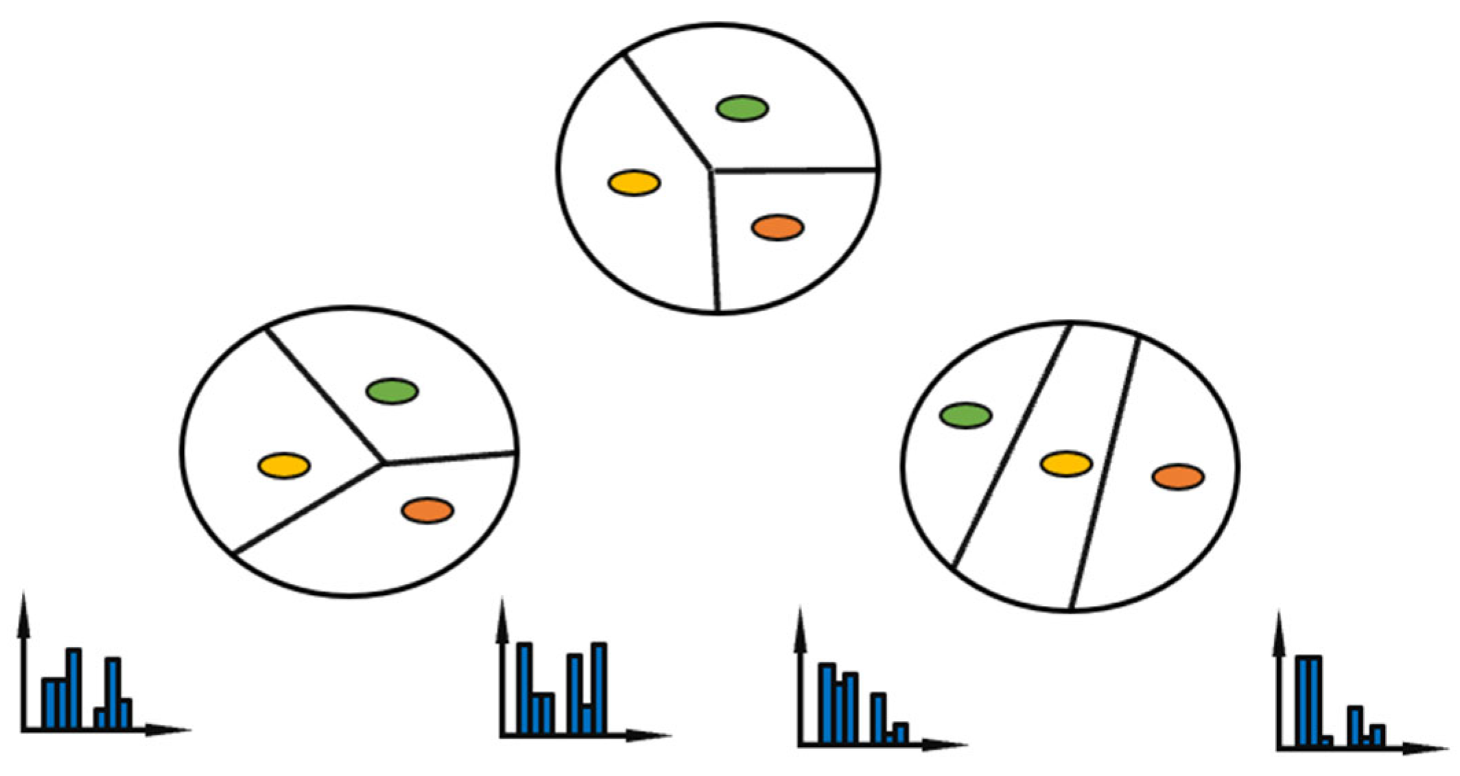 Figure 1 illustrates the initial structure and probability details of the model. At each split node, a small subset of class centroids is preserved, and their Voronoi cells partition the local feature space. Each colored dot represents the centroid of a different class (e.g., green, yellow, orange). The straight lines between them denote the decision boundaries that separate regions of influence for each centroid. When a sample